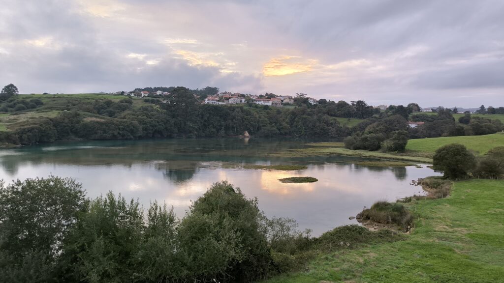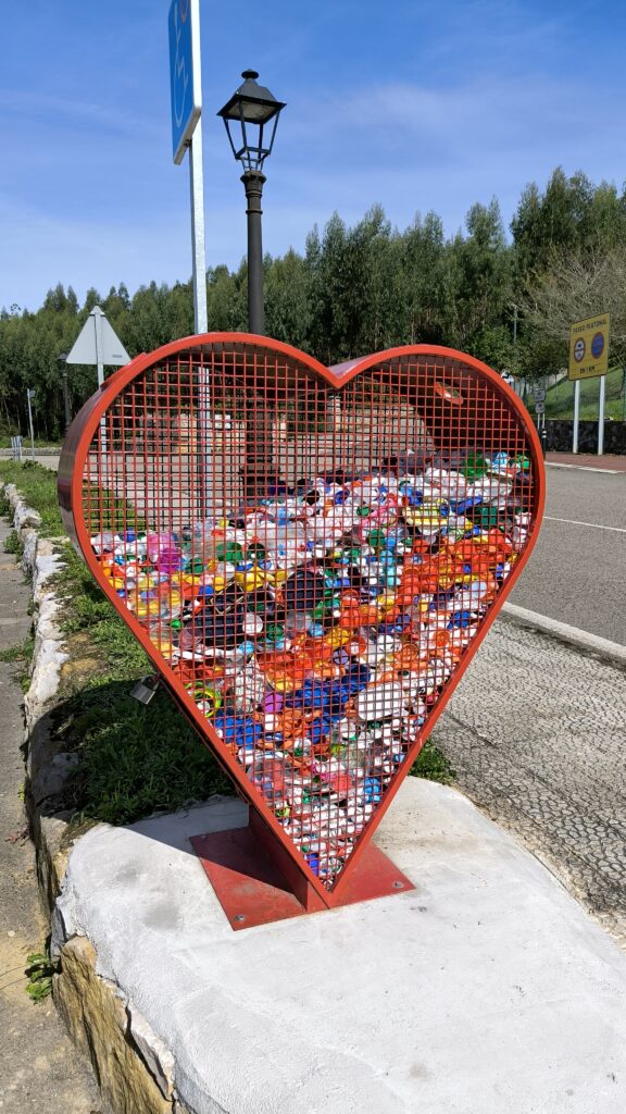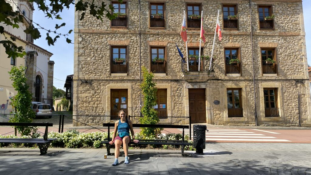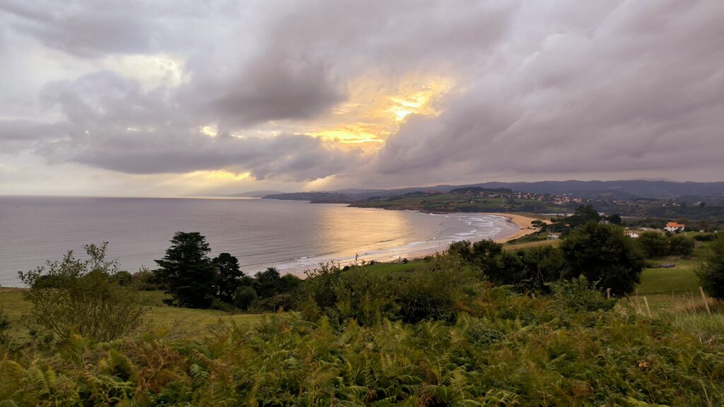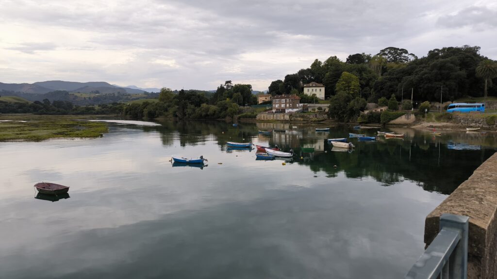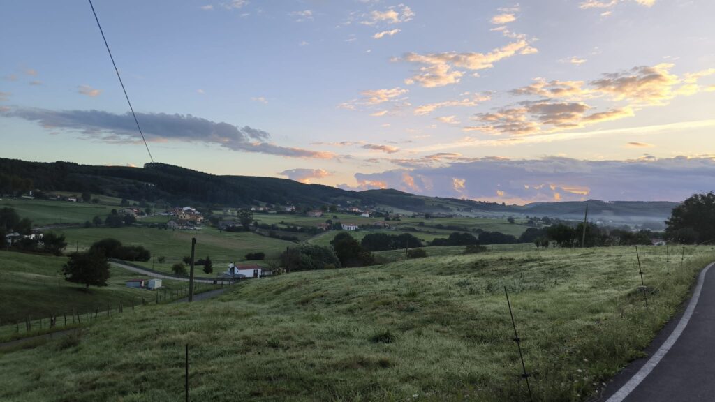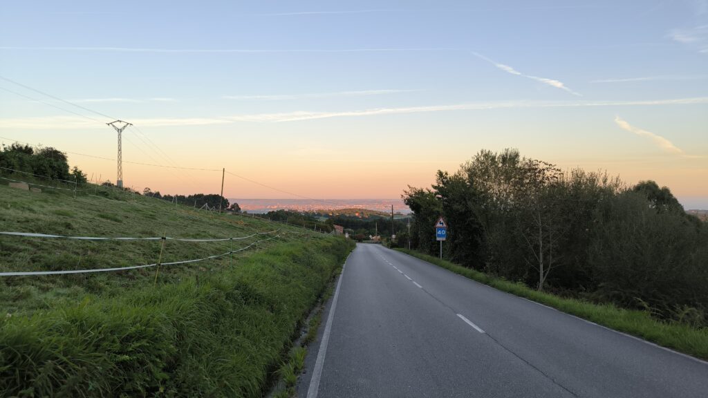 Erst ging der Weg noch auf der Straße an Feldern vorbei, schnell kam man dann aber auf eine große Straße, wo man um die 4km lang auf einem großen Seitenstreifen langlaufen musste. (Kann man sich wie eine Bundesstraße in Deutschland vorstellen). Leider ging es auch danach immer nur an großen Straßen weiter. Mal mit Seitenstreifen, mal ohne, was manchmal echt schaurig ist, da die Spanier nicht die langsamsten Autofahrer sind. Mittags kam ich dann in Avilés an und hab dort nett auf einer Parkbank Mittagsrast gemacht. Noch 17km. Auf dem Weg raus aus der Stadt hab ich noch an einem Obstladen halt gemacht und im nächsten Supermarkt noch Kekse und Schoki gekauft.
