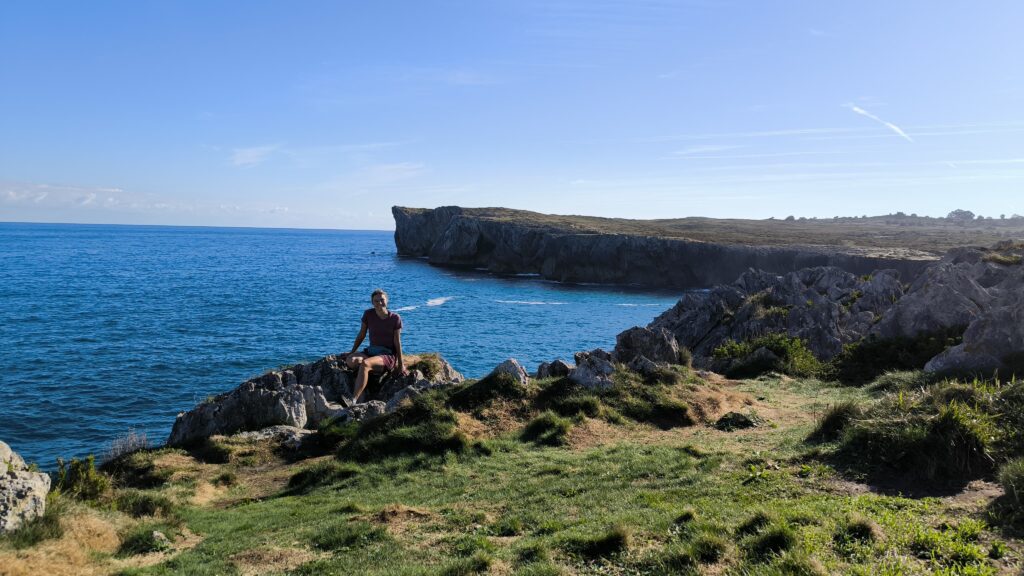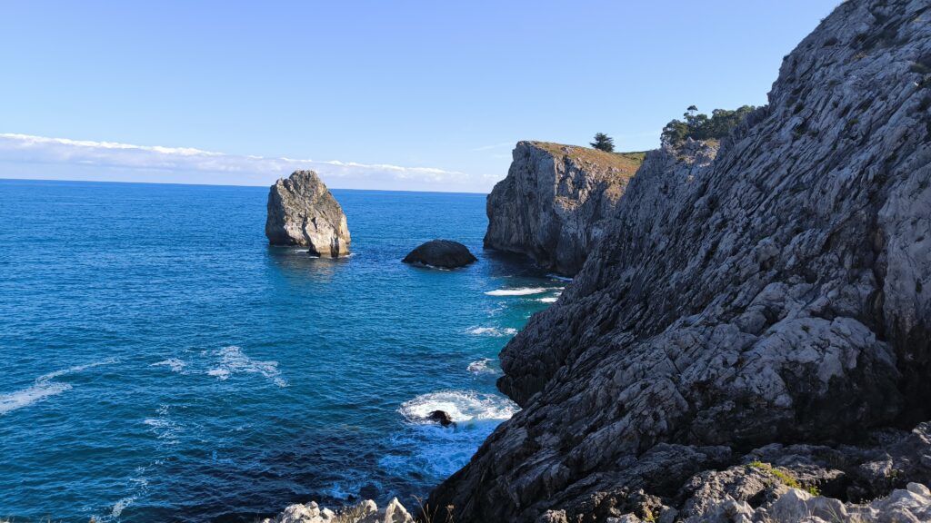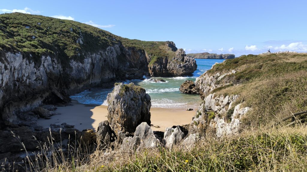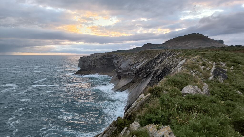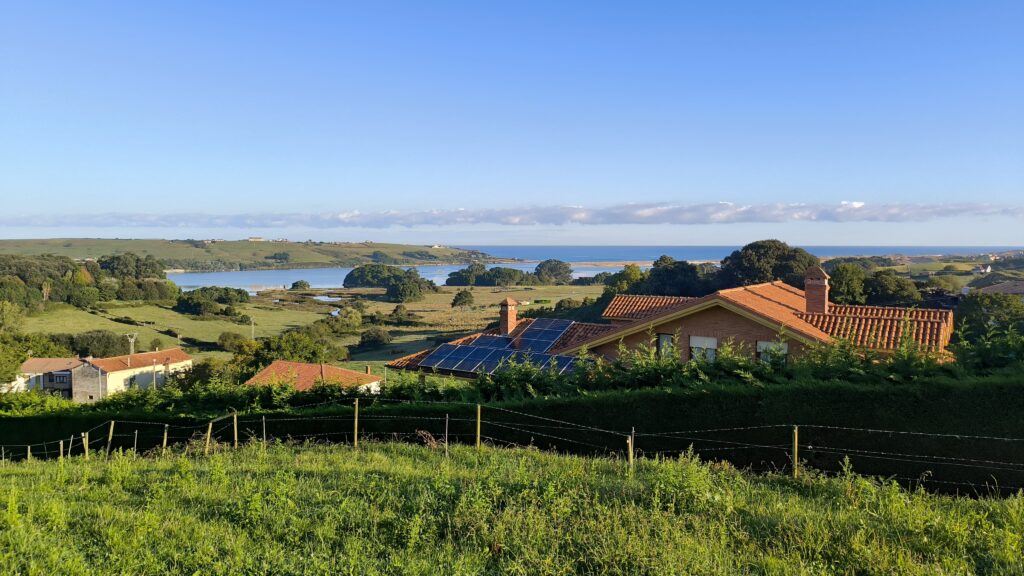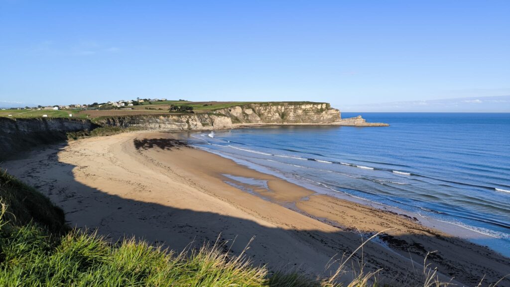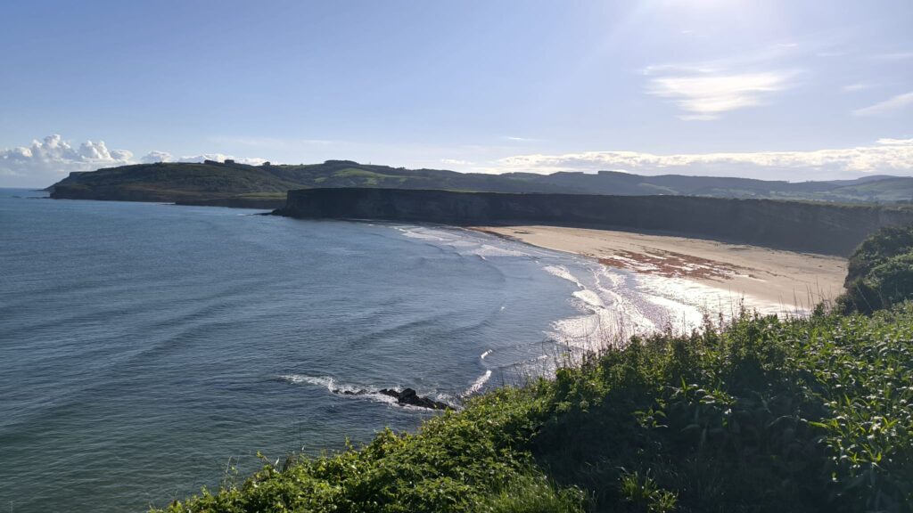 Erst ging der Weg noch auf der Straße an Feldern vorbei, schnell kam man dann aber auf eine große Straße, wo man um die 4km lang auf einem großen Seitenstreifen langlaufen musste. (Kann man sich wie eine Bundesstraße in Deutschland vorstellen). Leider ging es auch danach immer nur an großen Straßen weiter. Mal mit Seitenstreifen, mal ohne, was manchmal echt schaurig ist, da die Spanier nicht die langsamsten Autofahrer sind. Mittags kam ich dann in Avilés an und hab dort nett auf einer Parkbank Mittagsrast gemacht. Noch 17km. Auf dem Weg raus aus der Stadt hab ich noch an einem Obstladen halt gemacht und im nächsten Supermarkt noch Kekse und Schoki gekauft.