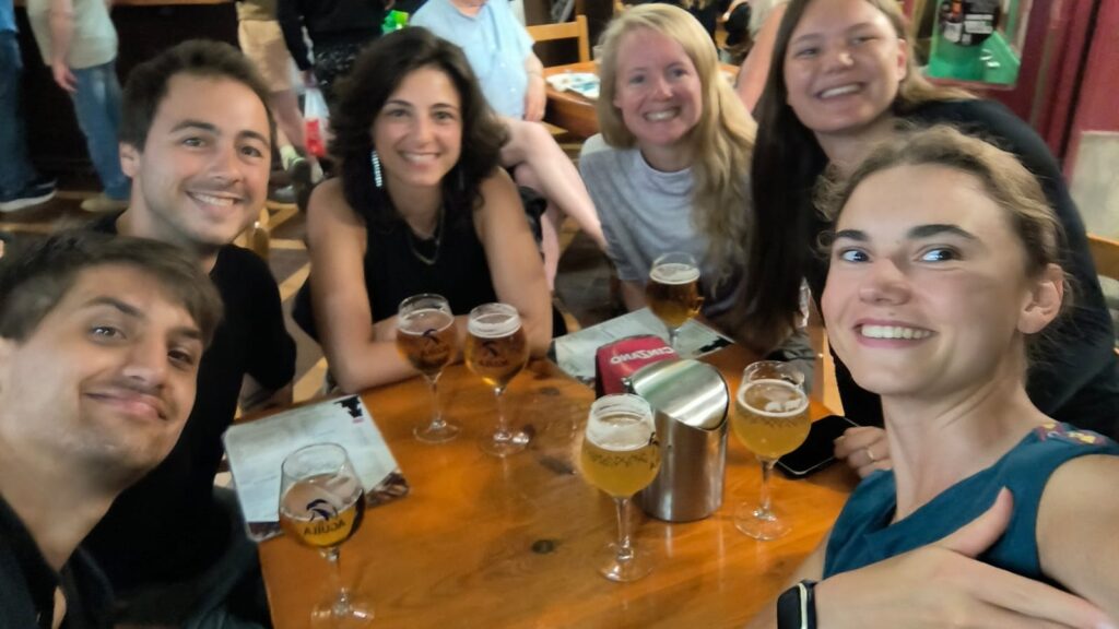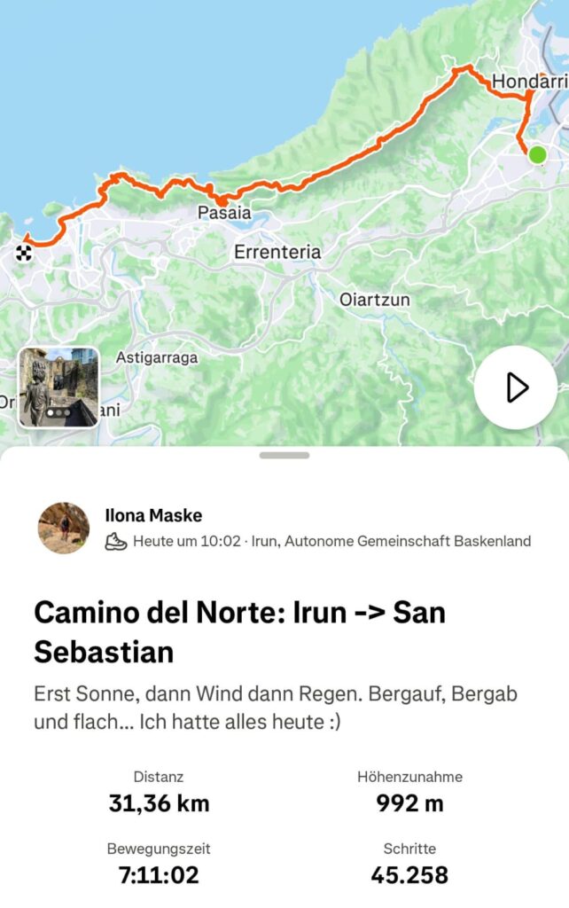 Abends habe ich dann Marie und Robin wieder getroffen (letztere hat noch einen Tag drangehangen, nachdem ich schon Goodbye gesagt habe). Wir haben uns noch auf ein Getränk getroffen, und es wurden nachher immer mehr bekannte Pilger, sodass wir nachher mit 8 Leuten am Tisch saßen. Dann musste Robin aber endgültig Tschüss sagen, da ihr Bus nach Bilbao fuhr. So nebenbei: für 2 Gläser Wein (0,1Liter) habe ich 2,2€ bezahlt. Abends war ich dann noch mit Marie essen. 22€ für Brot, Wein, erster Gang, zweiter Gang und Nachtisch. Wow! Und super lecker.